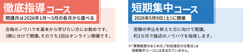 開講から本試験までの期間によって、2つのコースをご用意しています。受験申し込みの前から指導を受けられる「徹底指導コース」と、受験申し込みを終えた後に開講する「短期集中コース」です。さらに「徹底指導コース」は、開講日を3期分設けています。オンライン開催がメインとなるため、お勤め先のご事情やお仕事の込み具合、学習スケジュールなどと照らし合わせてご選択いただけます。