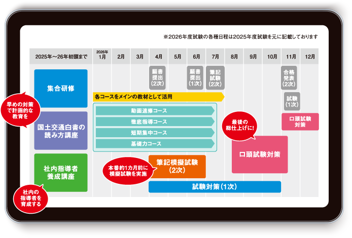 自社の計画、また受験を予定している方の理解度やスケジュールに合わせてオリジナルの研修メニューをご提供します。各コースをベースに、研修内容や実施時期を調整し長期に渡り手厚い資格取得支援を行います。
