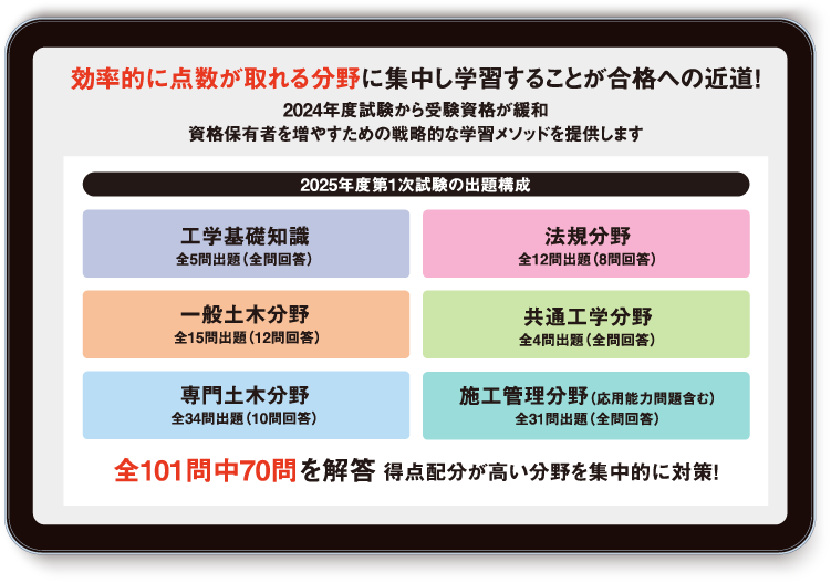 点数配分の高い一般土木、施工管理、法規を中心に解法の要点を徹底解説!