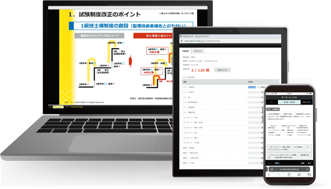 本サービスでは、1次検定の配点ウエイトが高く2次検定での出題箇所とも重複する「一般土木」「施工管理」「法規」の3分野を中心に基礎から学べる内容となっています。各分野の要点を動画講義とテキストで効率的に学習することができます。1次検定のみならず、難易度の高い2次検定の合格に向けた基礎力を養成する本サービスをぜひご活用ください。