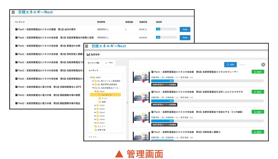 履歴管理者は、コンテンツ視聴達成度(総視聴コンテンツ数×総視聴時間)で、一般ユーザーの達成率をグラフで視覚的に把握できる画面構成になっています。