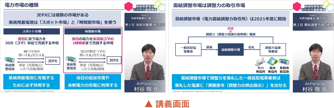 本講座では、蓄電池ビジネスで登場する「調整力」や「同時同量」といった用語の定義から、蓄電システムの選定や設備工事などの進め方、電力取引によって収益を得る方法など、系統用蓄電池ビジネスの導入から実践までをカバーしました。特に、JEPX(日本卸電力取引所)や需給調整市場、容量市場の約定価格の決定方法や実際の取引方法は手厚く解説しており、収益化の方法を学べます。収益シミュレーションの手順は具体例を用いて説明していますので、自社で実施する際の精度を高めることが可能です。